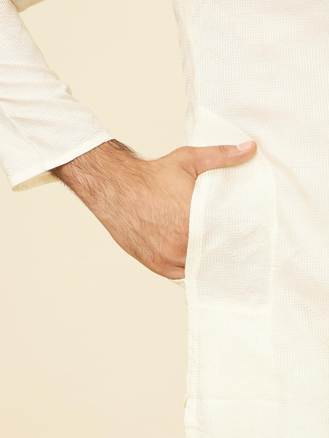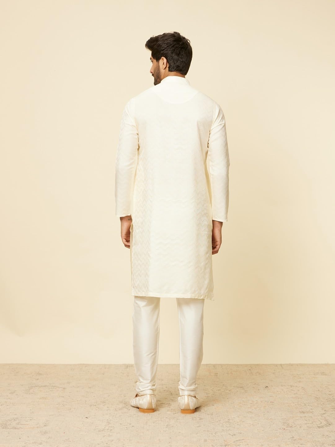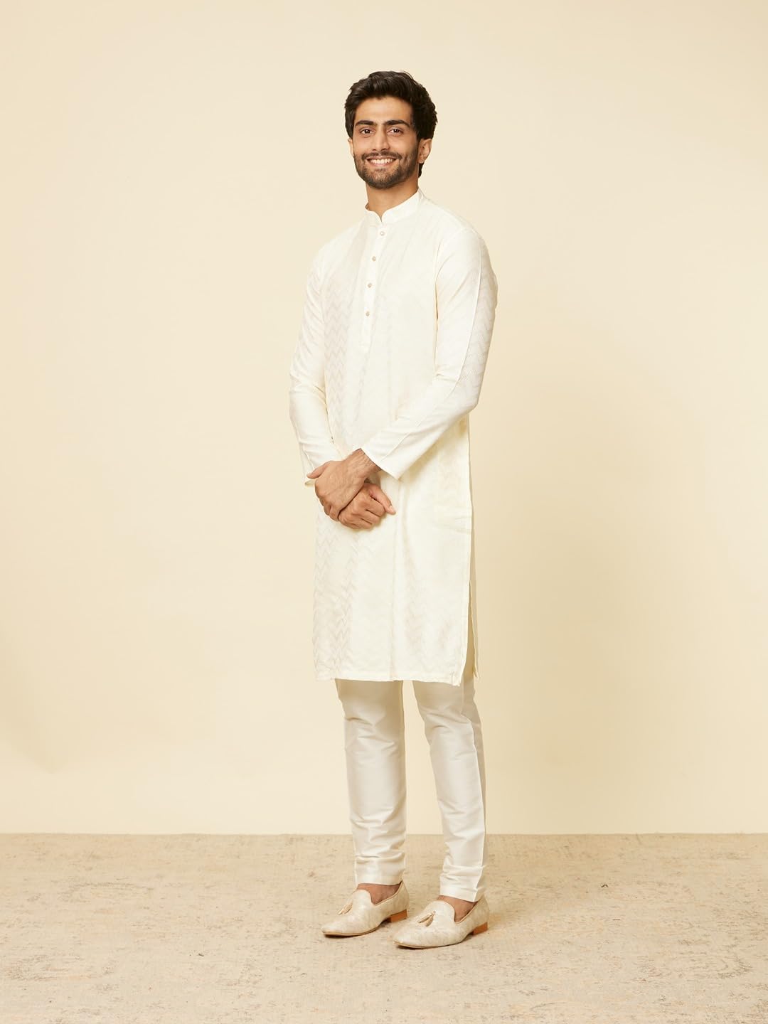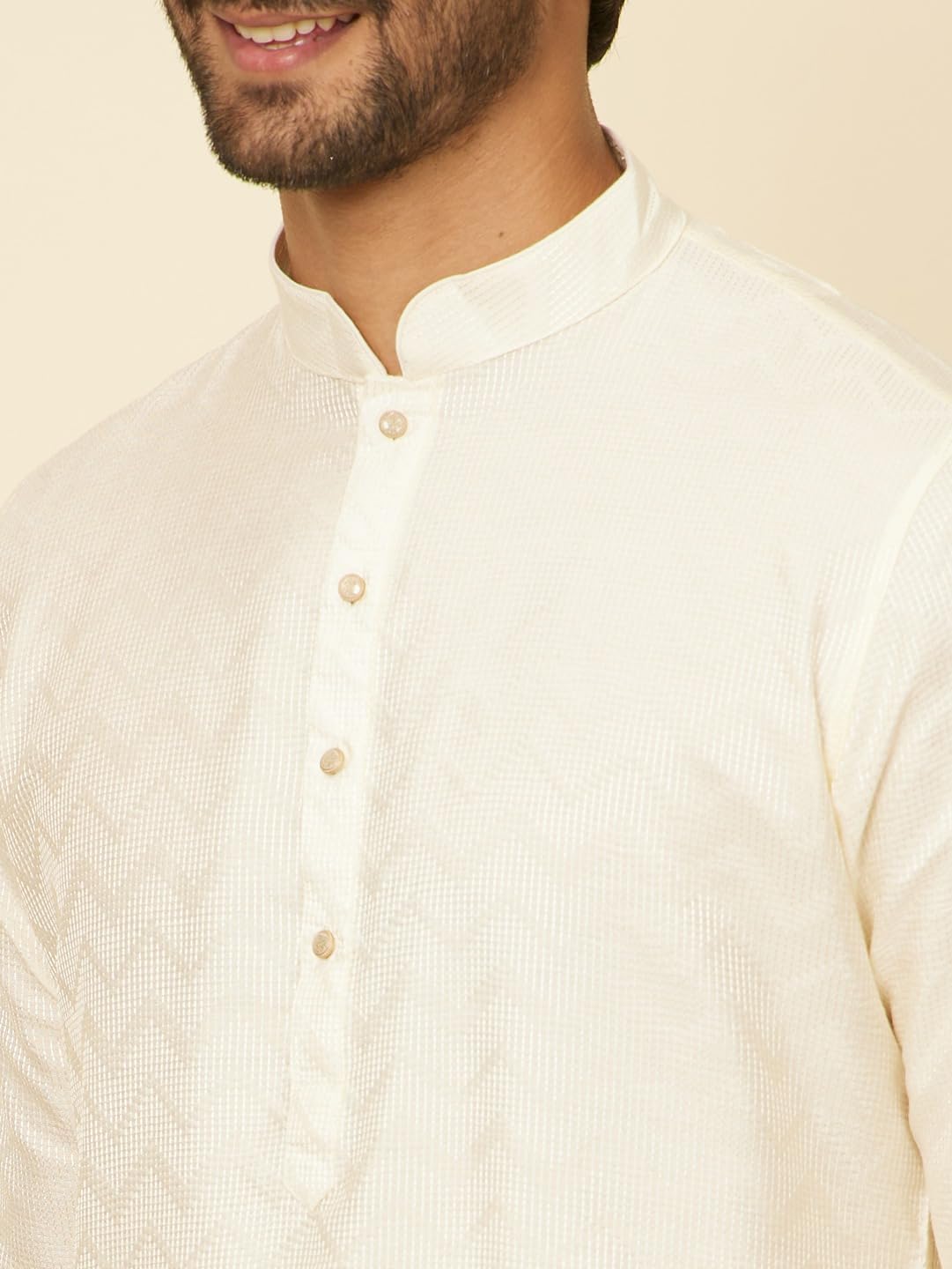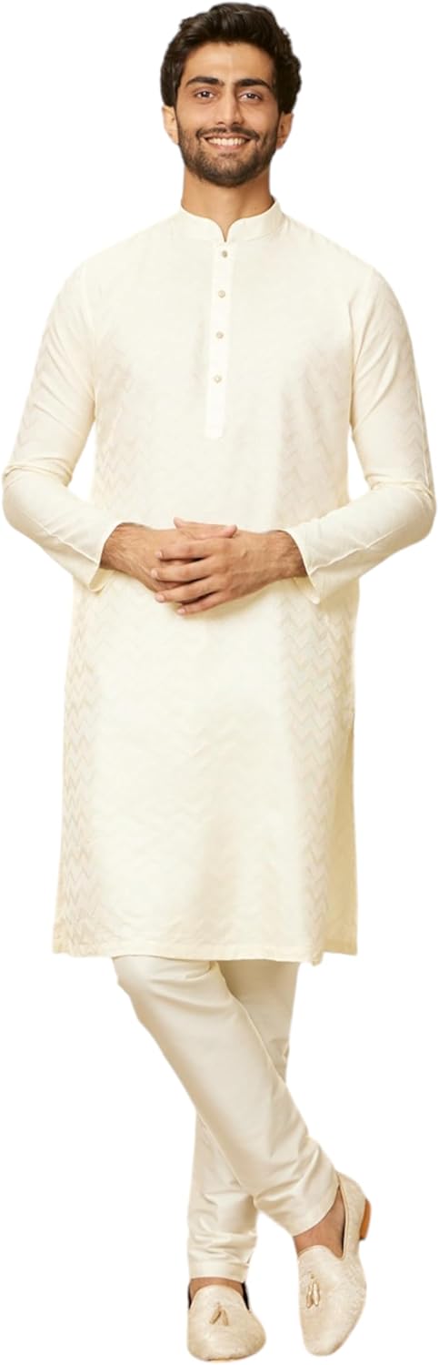 Package Contains: 1 Kurta 1 Pyjama Design: This cream kurta and pajama set, fashioned in a bandhgala style, features a sophisticated Ikat pattern all over the textured fabric. The design is elevated with elegant enamel buttons on the placket, offering a blend of contemporary and classic aesthetics.