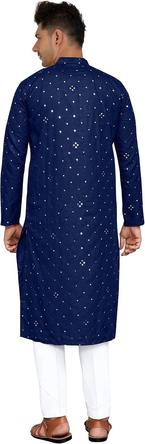 Striking 2 piece Kurta Pajama with mirror work, includes a top (Tunic / Kurta) and drawstring waist trousers (pajama). An elegant Poly Cotton Kurta with thread embroidery and mirror work paired with a classic cotton feel Pajama. See size chart (included within images) for size details. Dry clean only.